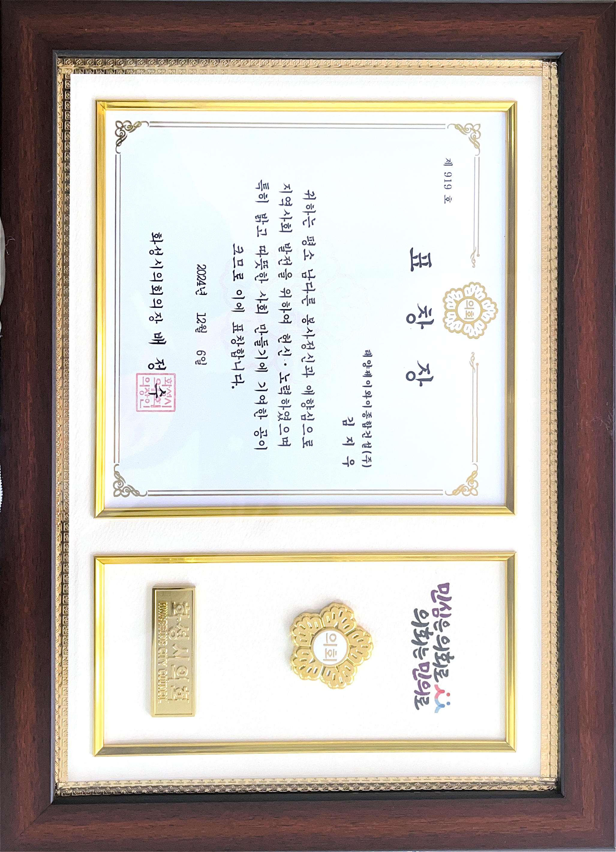 화성시의회 표창장